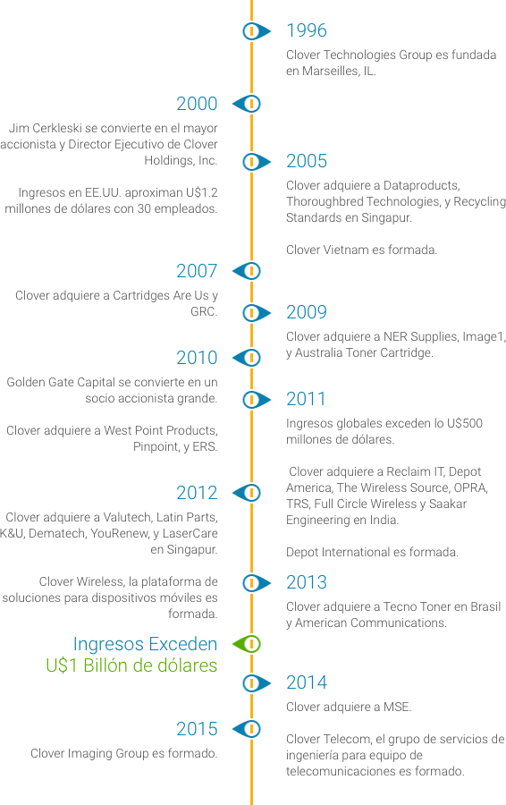Veinte años después, mediante adquisiciones estratégicas y crecimiento orgánico, Clover se convirtió en una empresa internacional multimillonaria que ofrece servicios a todas las facetas de la industria de imágenes, desde manufactura hasta recolección, servicios y repuestos.